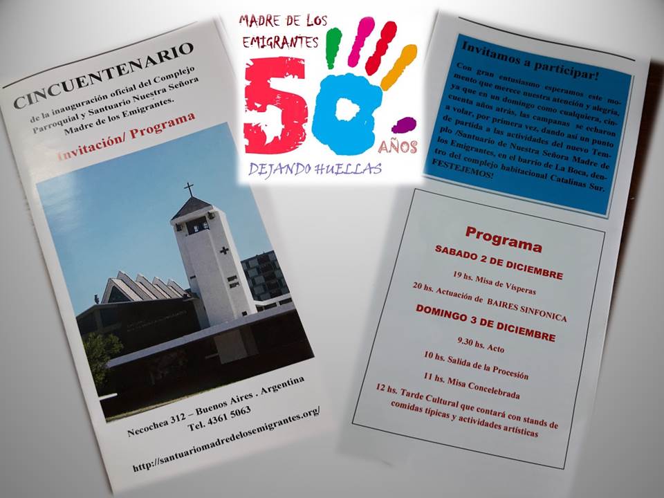 El 3 de diciembre de 1967, las campanas del nuevo templo MADRE DE LOS EMIGRANTES, anunciaron a viva voz la gloria de Dios y el agradecimiento por ver concretada una obra al servicio de la comunidad en sus variadas procedencias y riquezas culturales. Como toda obra que llega a su fin, el origen, los fundamentos y los comienzos son significativos para ser recordados y entregados para su mayor aprecio. En noviembre de 1956 llegó desde el norte de Italia el cuadro trayendo la imagen de la Madre de los Emigrantes, por ser Argentina, particularmente, el país que recibió una de las mayores cifras de emigrados italianos. La imagen comenzó un peregrinaje por distintas ciudades, recibiendo la devoción y afecto de centenares de creyentes. El regreso a Buenos Aires fue magnífico por el recibimiento que el pueblo y decenas de colectividades brindaron a la Madre de los emigrados. Se paseó el cuadro, guiado por la Armada Nacional, a través de las importantes avenidas de la ciudad y luego fue llevado a la Catedral Metropolitana. Allí permaneció hasta el 11 de julio de 1957, en que fue recibida oficialmente por los Misioneros de San Carlos, la congregación fundada en Italia por el Beato Juan Bautista Scalabrini para dar asistencia a los migrantes. Los padres scalabrinianos colocaron la imagen en el altar mayor de la sencilla capilla de la Vera Cruz, ubicada en Av. Almirante Brown 568, teniendo como párroco al Padre José Guadagnini. Más tarde, el Arzobispo de Buenos Aires, Mons. Caggiano, bendecía oficialmente la primera parroquia de la Vera Cruz y Madre de los Emigrantes. Un joven sacerdote proveniente de Brasil, el P. Adelino de Carli llegó a la capilla con su dinamismo e inquietudes. Al comenzar la década del ´60, la zona de Catalinas Sur va cobrando una nueva fisonomía. Los terrenos de la empresa Le Britain y del ferrocarril son testigos de las torres que el Plan Municipal de la Vivienda va levantando en la zona. La capilla no daba abasto para albergar a los fieles que se iban sumando, razón por la que el P Adelino, ya párroco muy movilizado, gestionó ante las autoridades la entrega de un predio para construir el complejo de parroquia y escuela en ese lugar. El permiso llegó con la alegría del grupo parroquial y del barrio populoso que se iba gestando. La piedra fundamental y los planos fueron bendecidos en Roma por SS Pablo VI, que bendijera anteriormente, el cuadro de la Virgen como obispo en Milán. Se dio así el comienzo de una tarea fuerte de la comunidad barrial y empresarial para reunir fondos destinados a la construcción del complejo que se terminó en ocho meses. La gestión del P Adelino fue admirable por su entusiasmo y eficacia. Estos dones contagiaron al presidente de la empresa automotriz Fiat que con su gran caudal operativo, aceleró los pasos de la construcción. Recuerdo cuando se finalizó la colocación del techo del santuario. El enorme salón, la futura iglesia, se tradujo en un comedor de grandes tablones y caballetes para compartir fraternalmente un asado, junto al Arzobispo antes nombrado, como es nuestra costumbre. Grandes artistas brindaron sus obras para dar bienvenida, luz, color y clima de recogimiento. Roberto Capurro y Benito Quinquela Martín, en las obras del exterior; Armando Sica, Antonio Ballester Peña y Raúl Russo fueron los autores de los vitraux que la empresa Petracca realizó. En la zona de confesionarios, donde hoy se encuentra el cinerario, se destaca la obra de Mariette Lidys, exquisita artista plástica francesa que ante la emoción por la envergadura de la obra entrega el Cristo que nos interpela y conmueve. El altar es una pesada pieza de mármol traído de Carrara. Con el tiempo, hubo algunos cambios, como la inclusión de la estatua de Mons. Scalabrini que se descubrió el nueve de noviembre de 1997, día de su beatificación en Roma, brindando su mano extendida, obra del escultor Biaggio Gurrieri. La capilla de la derecha alberga numerosas devociones de distintos países que vienen al Santuario para celebrar a sus santos. Los cuadros del Vía Crucis, eficazmente interpretados, nos recuerdan en el ladrillo a la vista de las paredes, los últimos momentos y resurrección de Nuestro Señor. Pasaron los años, entramos en las vísperas de los 50. La Parroquia Santuario en el camino pastoral con sus grupos, destacando la labor del Grupo Scout Luigi Favero, junto al Colegio con su dinámica educativa, conforman una sólida presencia que sigue, en un marco plural, los objetivos del siempre vigente, en la realidad migratoria, Mons. Scalabrini e invoca vivamente, la protección celestial de la Virgen Madre de los Emigrantes, madre que acompaña a los desplazados, madre solidaria y MADRE NUESTRA.