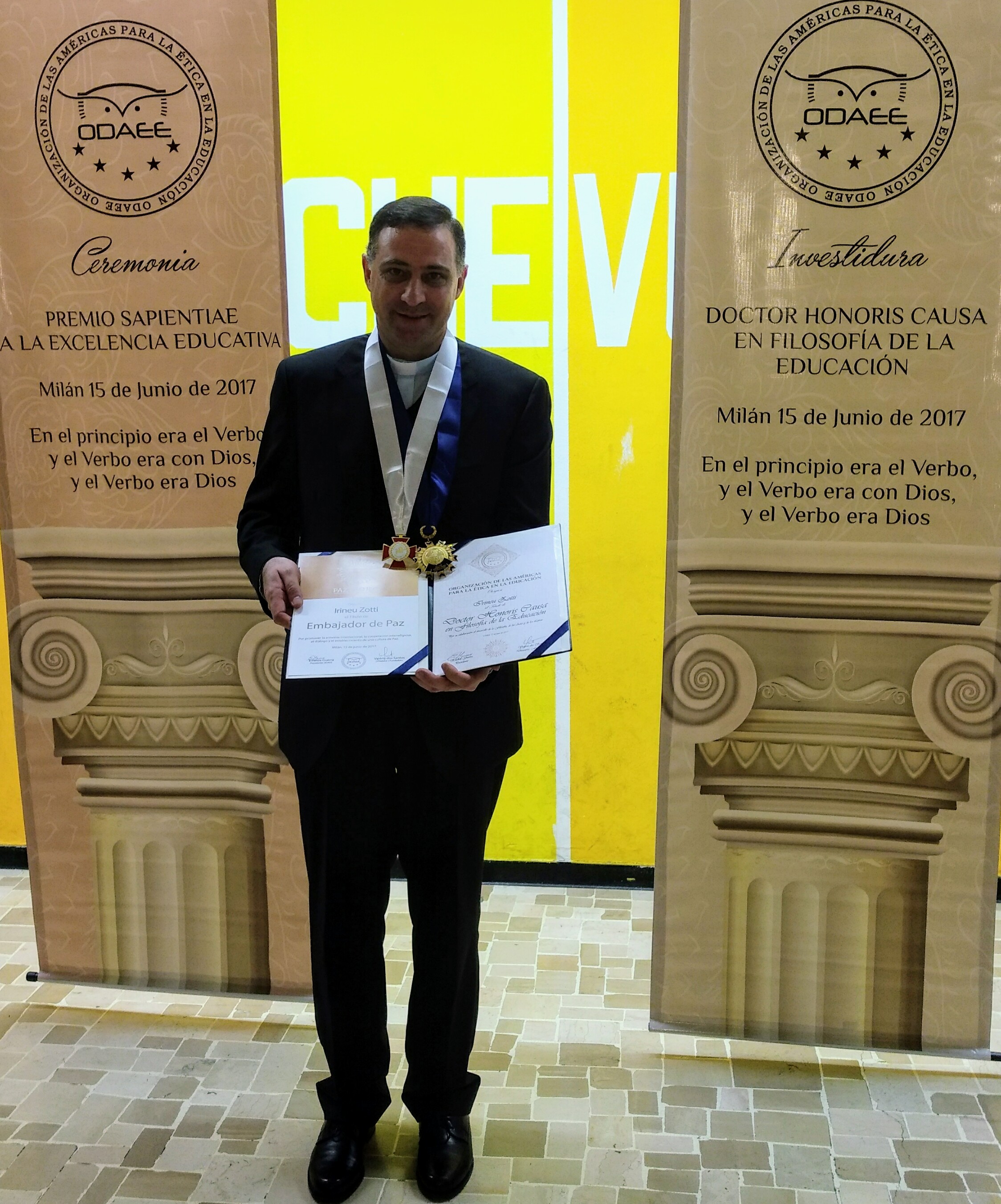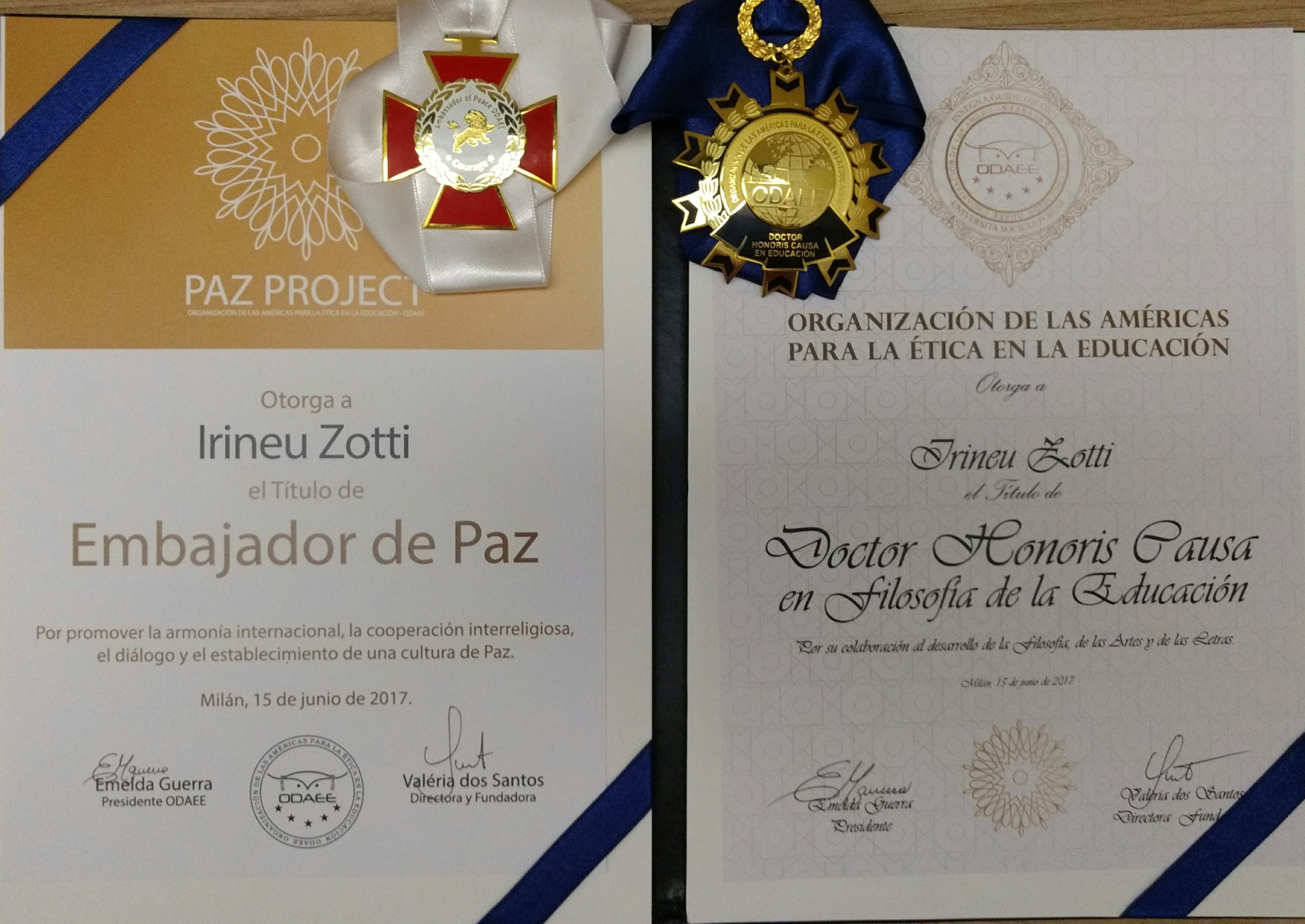 El pasado 15 de junio del corriente año el Padre Irineu viajó a Milán (Italia) para recibir las Distinción de "Embajador de Paz" y "Doctor Honoris Causa en filosofía de la Educación".