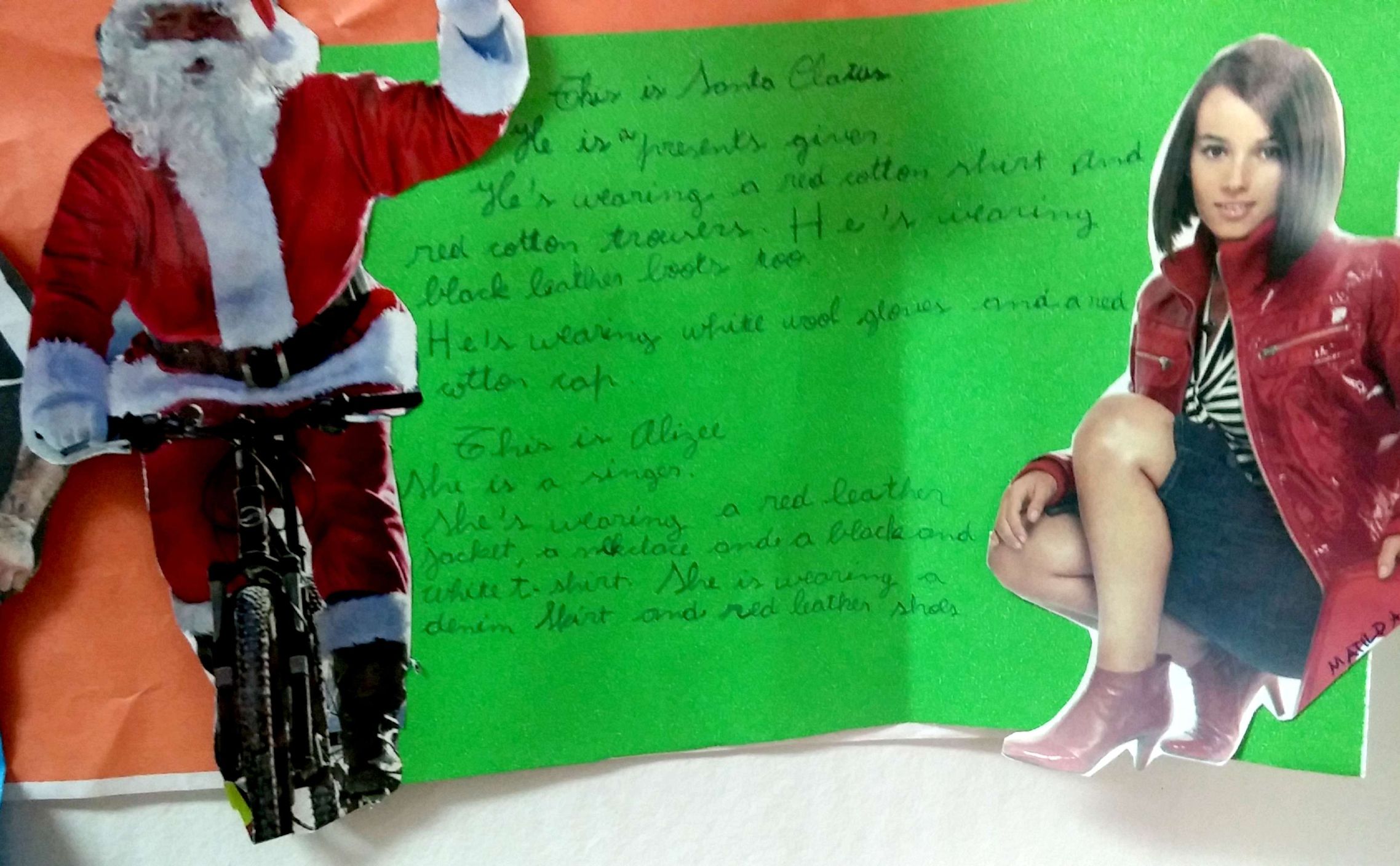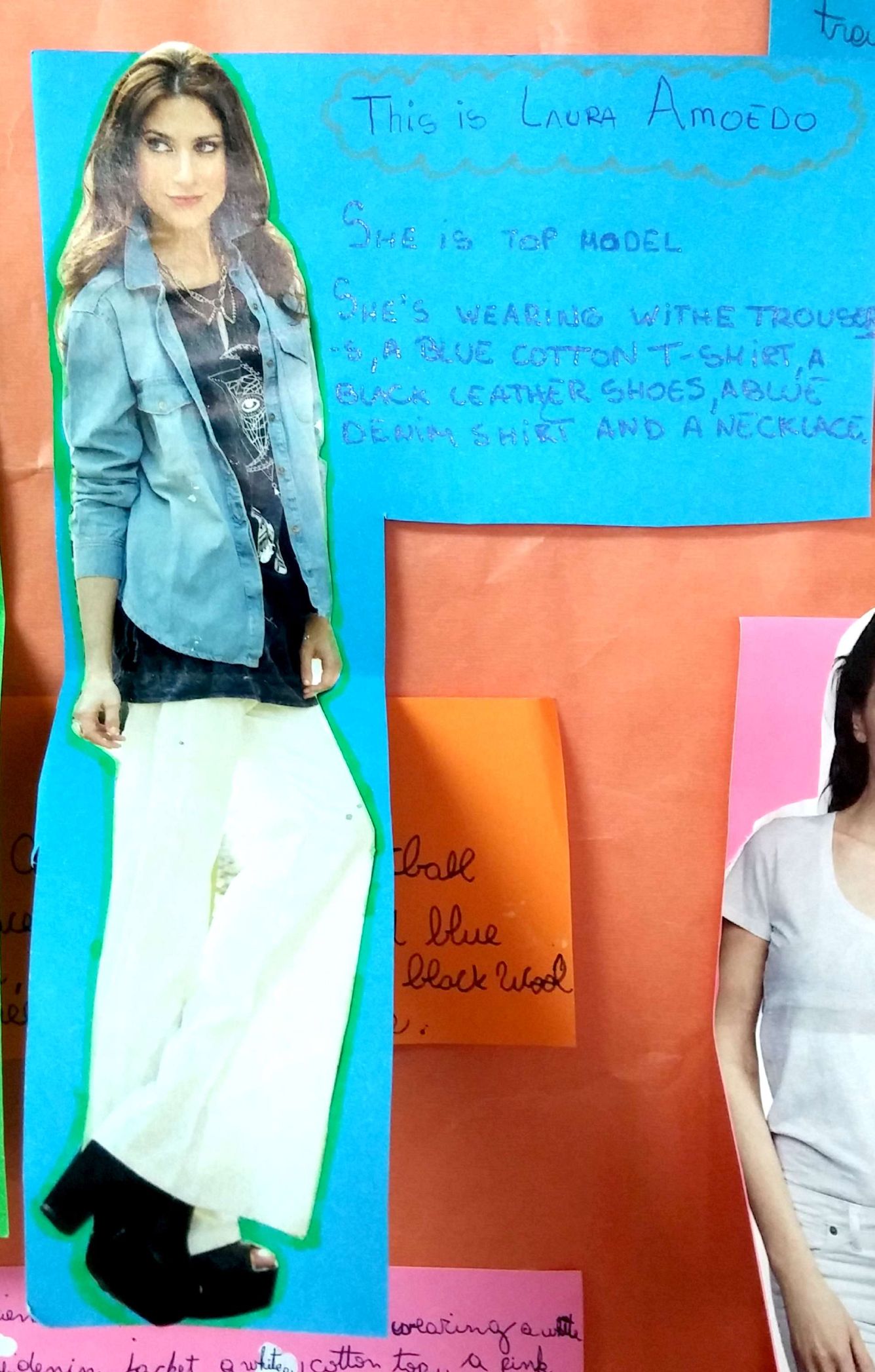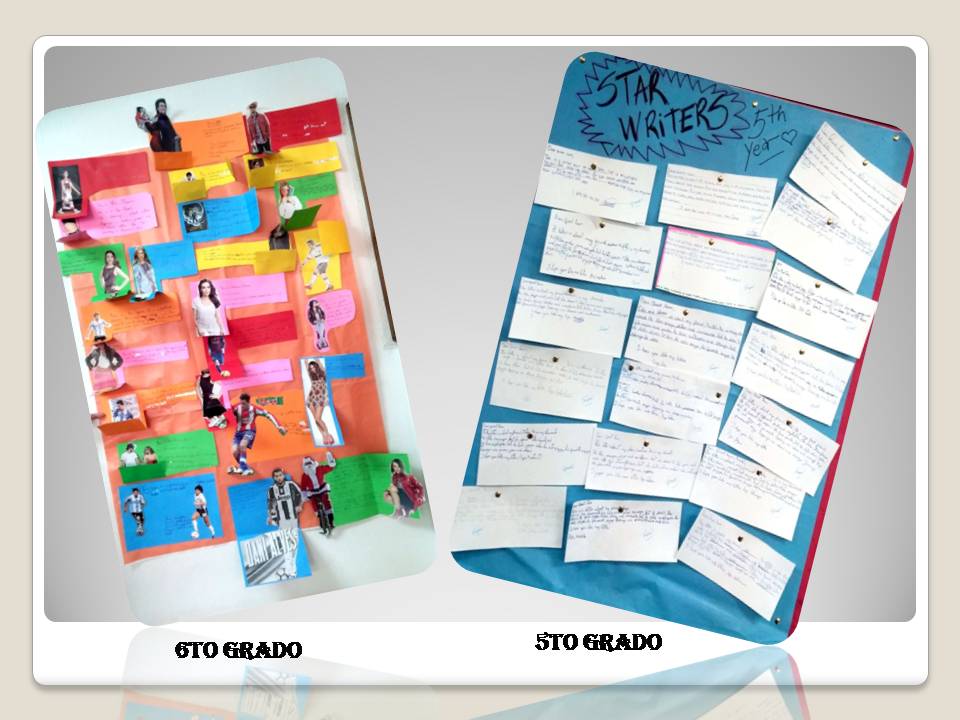 Utilizando el recorte de un personaje famoso de una revista, los alumnos de sexto grado ponen en práctica el vocabulario(ropa y accesorios) y estructuras gramaticales (presente continuo) trabajados en clase para describir el atuendo que dichos personajes están usando.