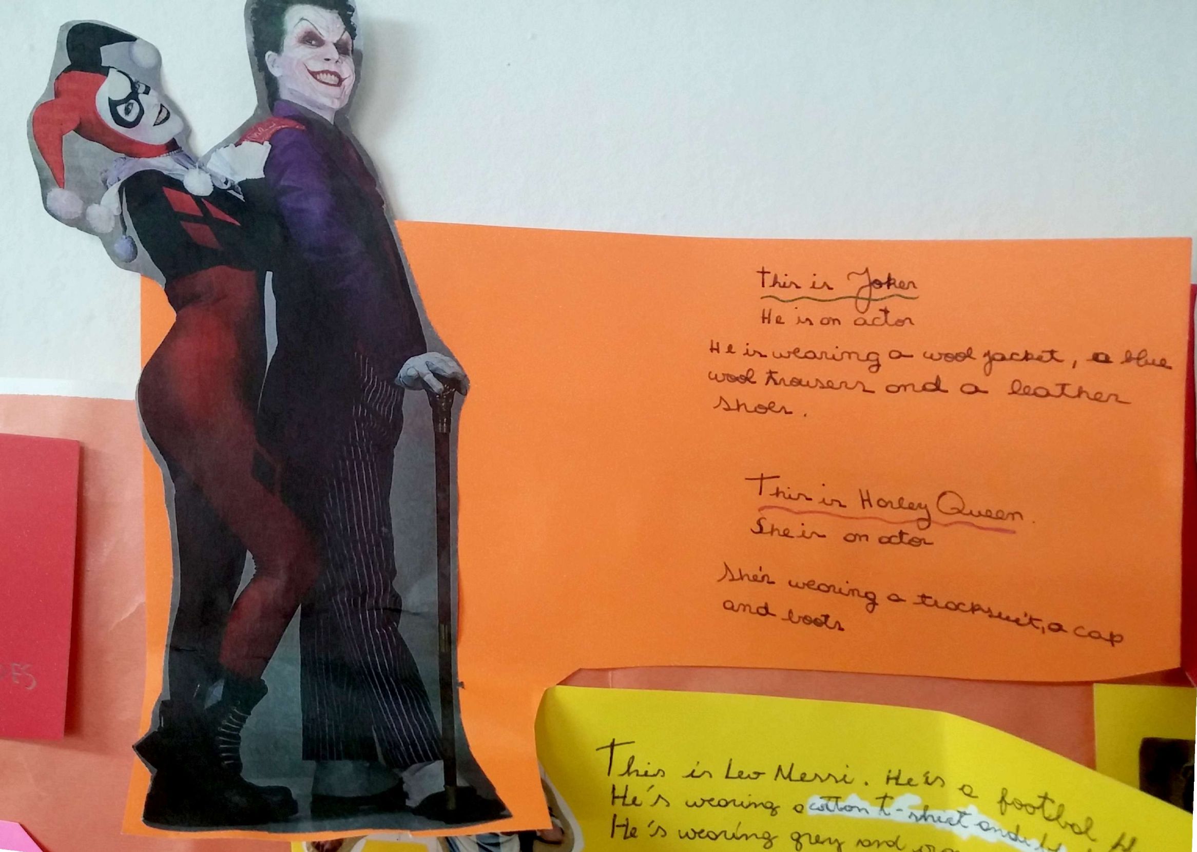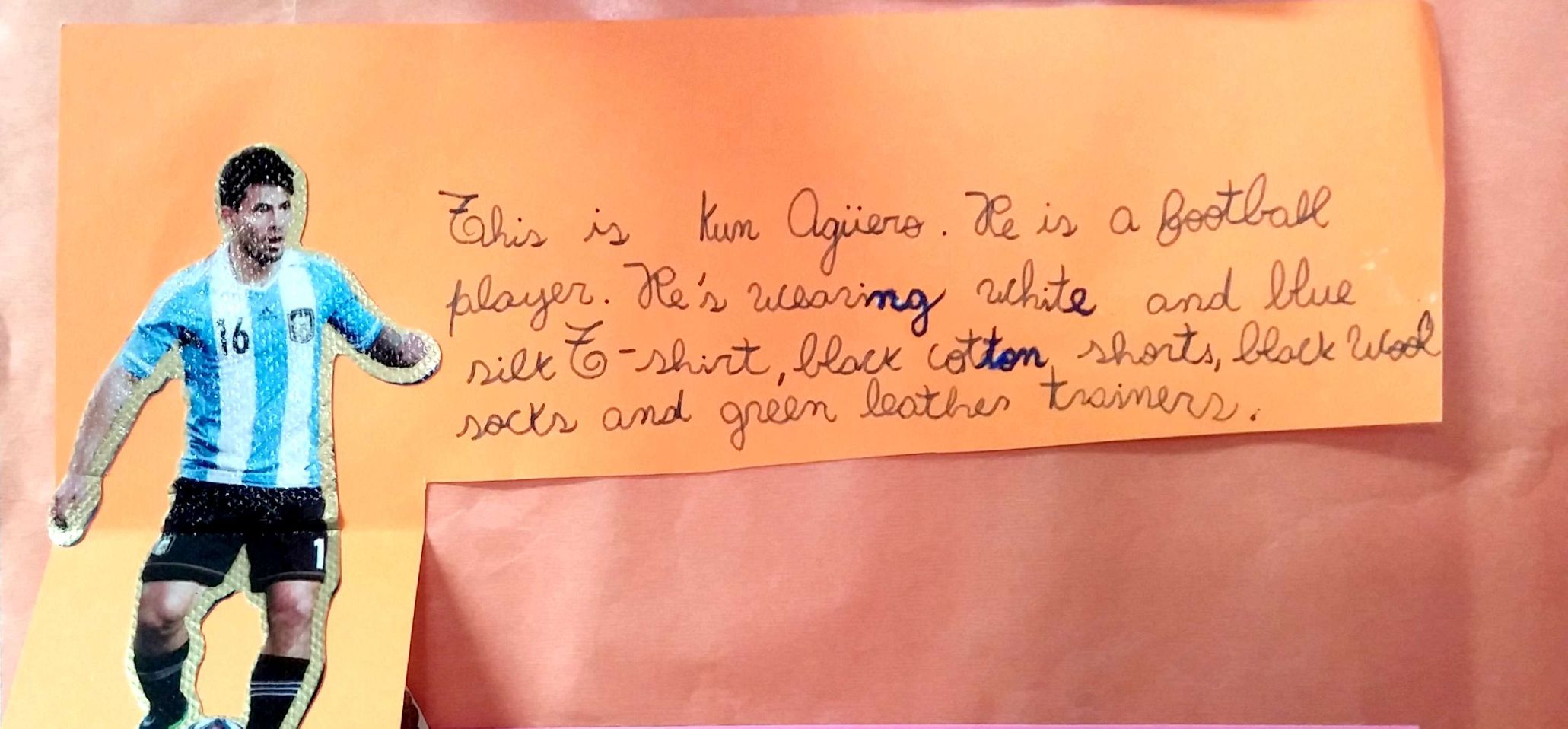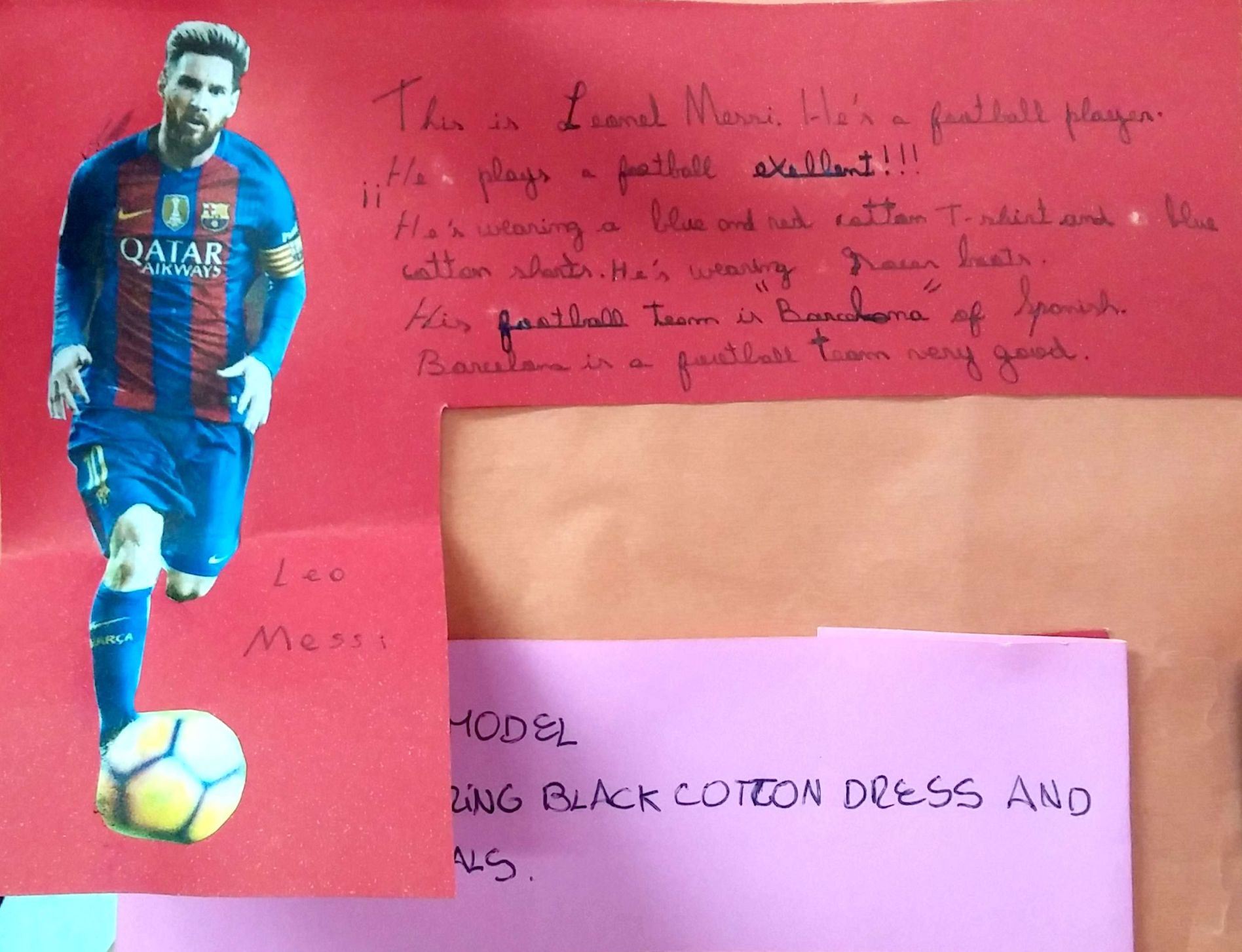 Utilizando el recorte de un personaje famoso de una revista, los alumnos de sexto grado ponen en práctica el vocabulario(ropa y accesorios) y estructuras gramaticales (presente continuo) trabajados en clase para describir el atuendo que dichos personajes están usando.