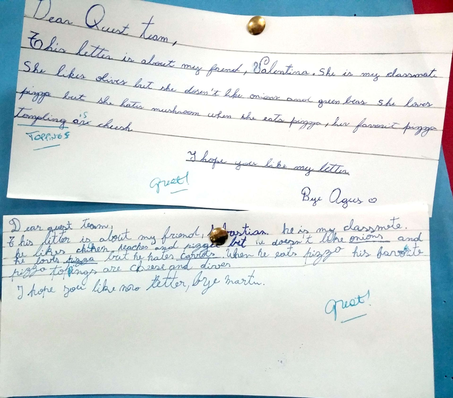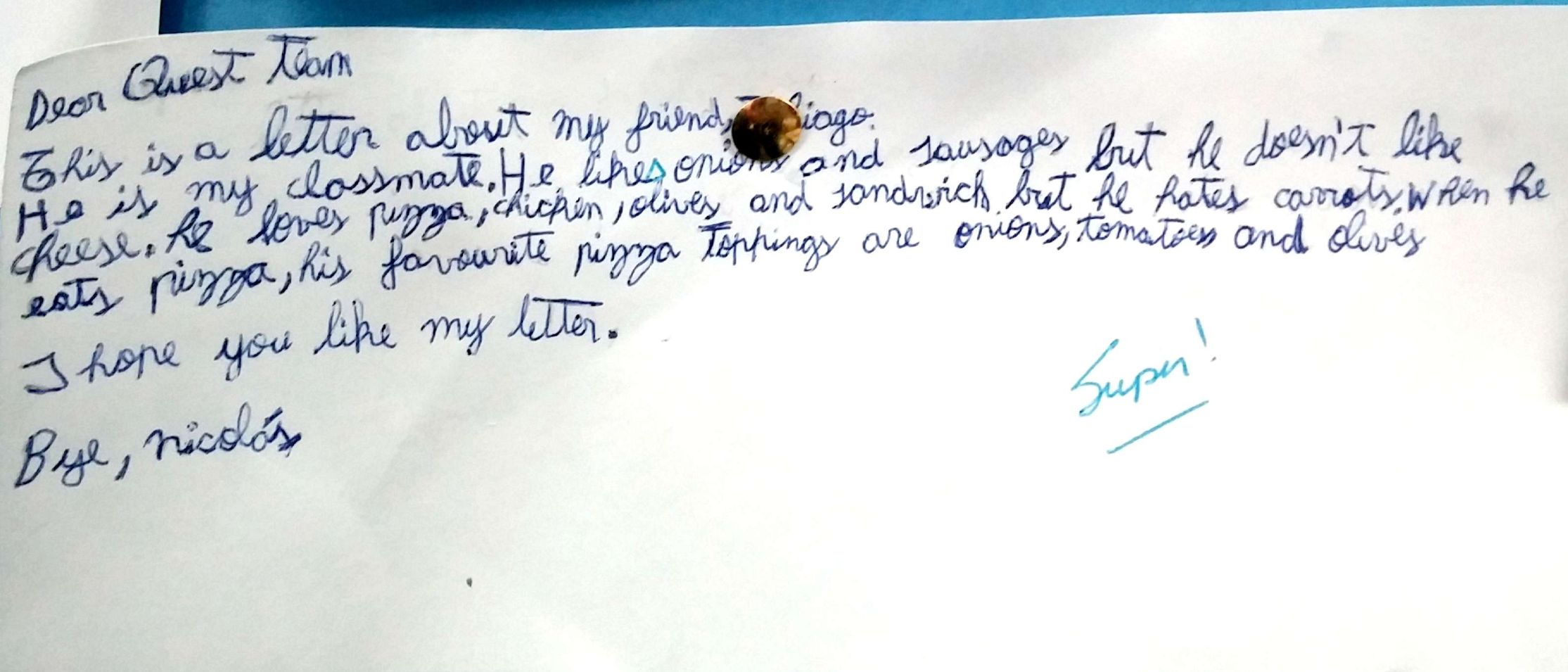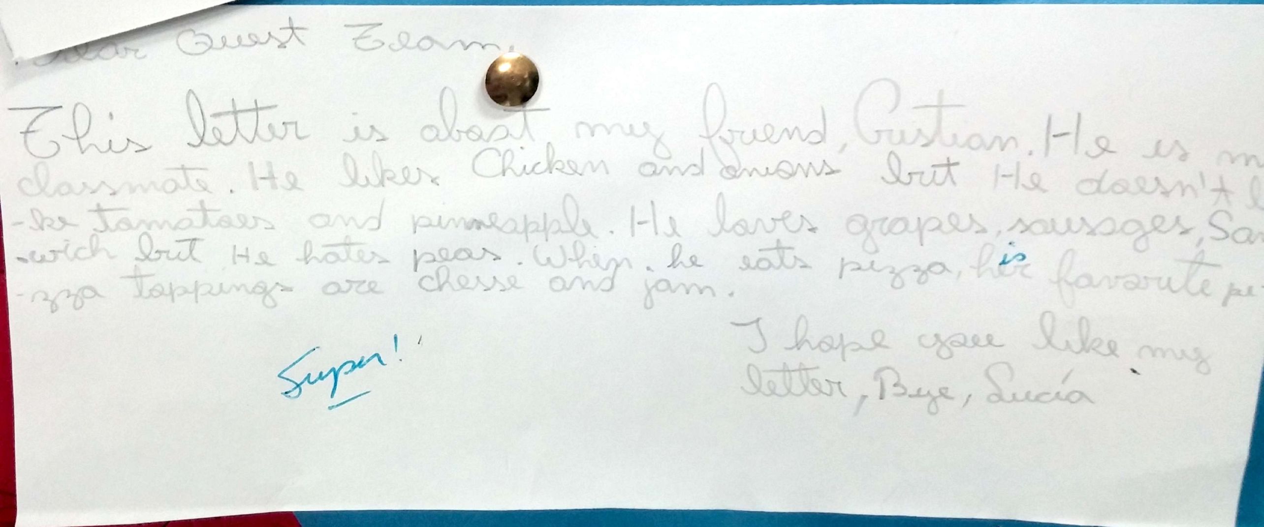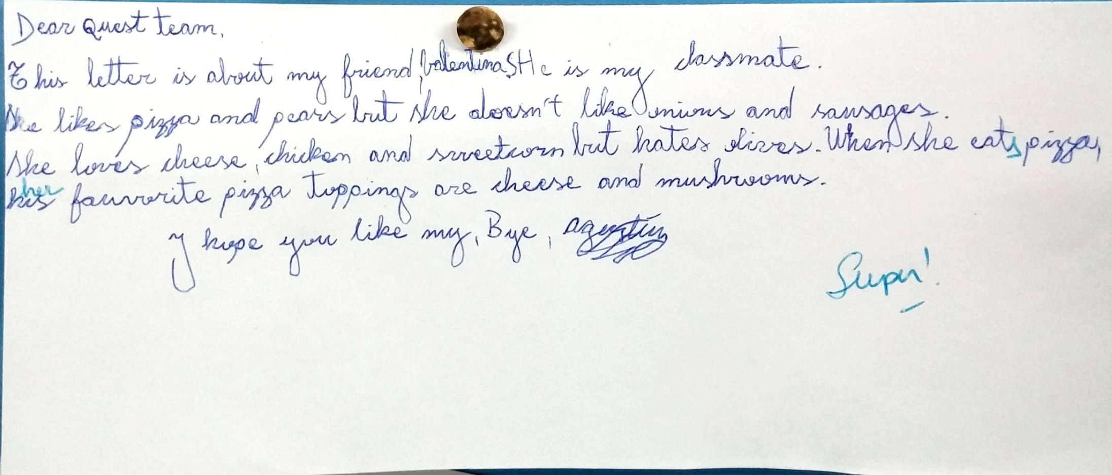 Después de haber trabajado en clase los gustos propios y de terceros con respecto a comida, los alumnos de quinto grado escribieron una carta al equipo del libro "Quest Team" contándoles acerca de un/a amigo/a y sus gustos personales. Para dicha tarea pusieron en práctica vocabulario conectado a comida y presente simple como estructura gramatical.