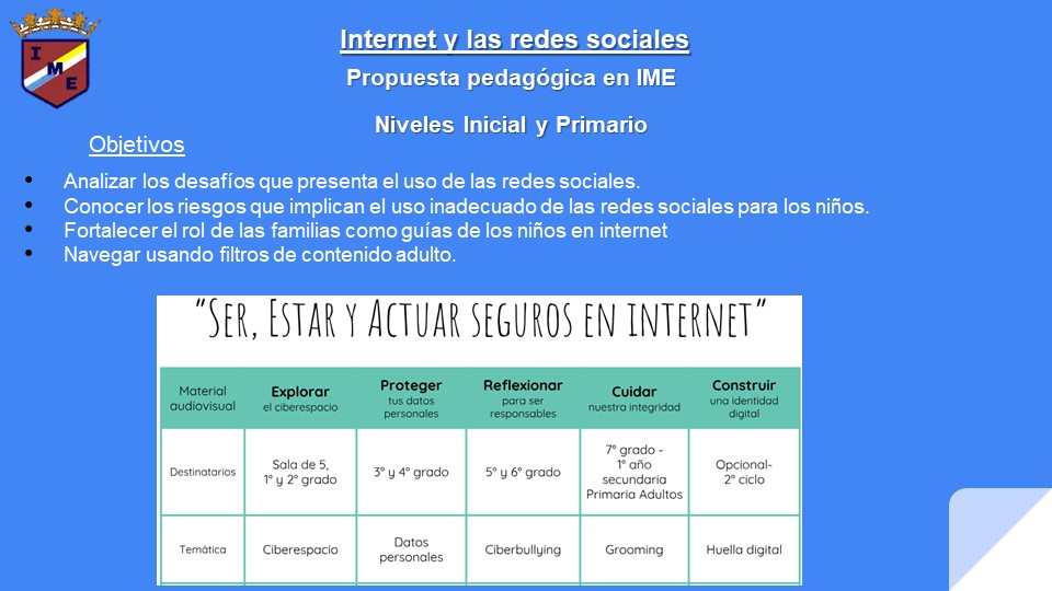 “Para promover la planificación creativa de actividades escolares utilizando Internet, es fundamental que toda la comunidad educativa conozca tanto sus funciones y recursos como los posibles riesgos para fomentar un uso responsable, solidario y crítico. En este último aspecto las normativas nacionales e internacionales referidas a la seguridad en Internet se encuentran en constante proceso de construcción debido a la extensión, intensidad y velocidad en la que se configuran las redes globales.