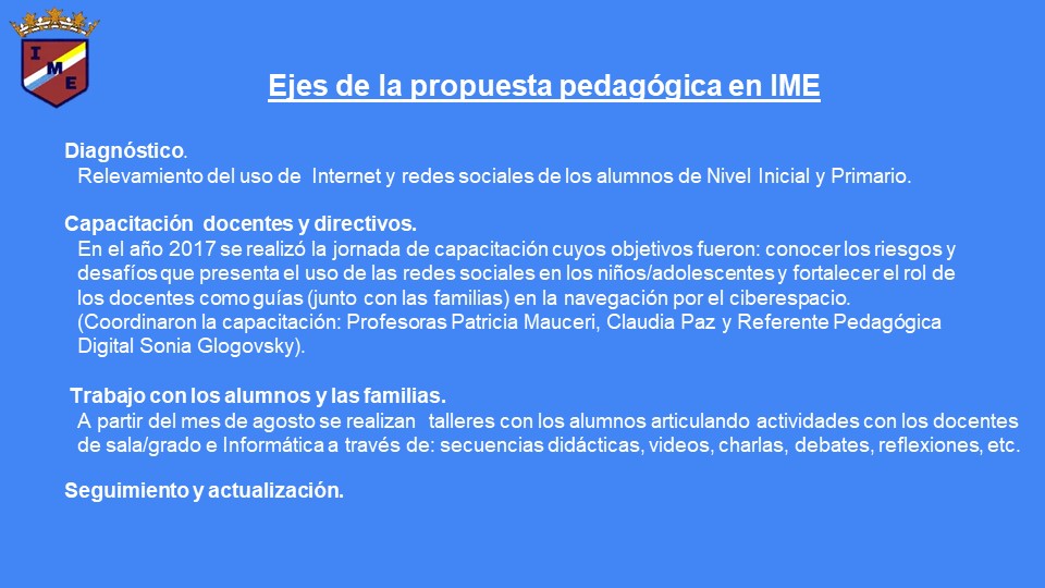 Por lo tanto, resulta vital generar ámbitos de diálogo para debatir, reflexionar y contribuir al desarrollo de habilidades necesarias para que los alumnos puedan integrarse de manera crítica y creativa en estos nuevos espacios como acercar orientaciones y estrategias de acción para el cuidado de la intimidad y la identidad en el marco de la cultura digital”.
