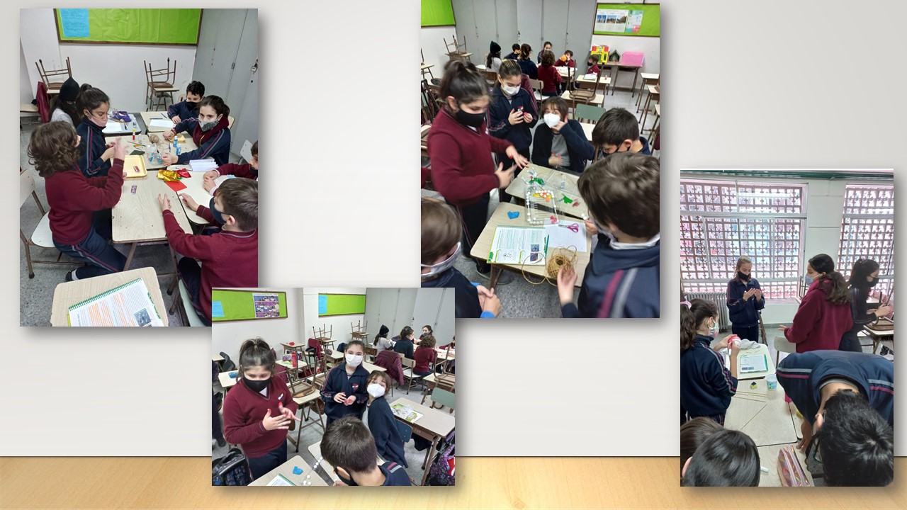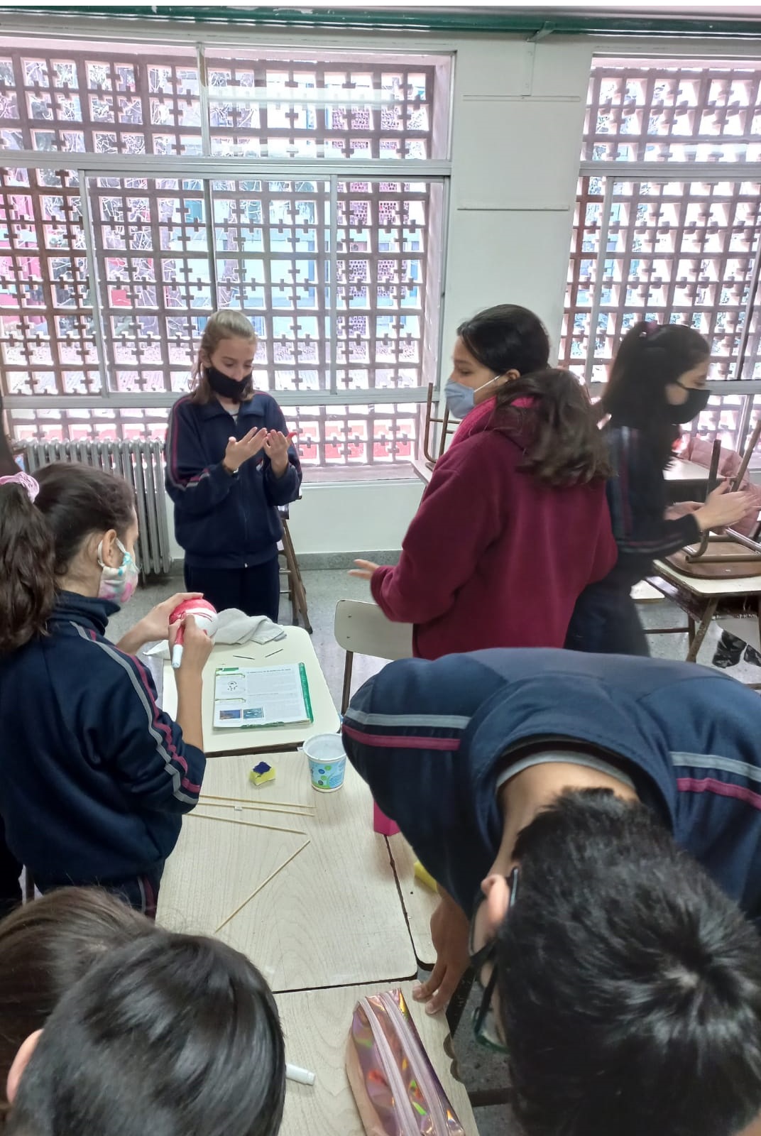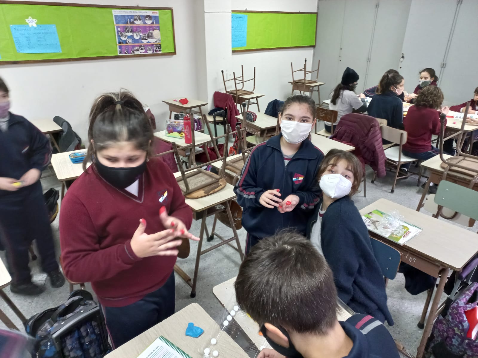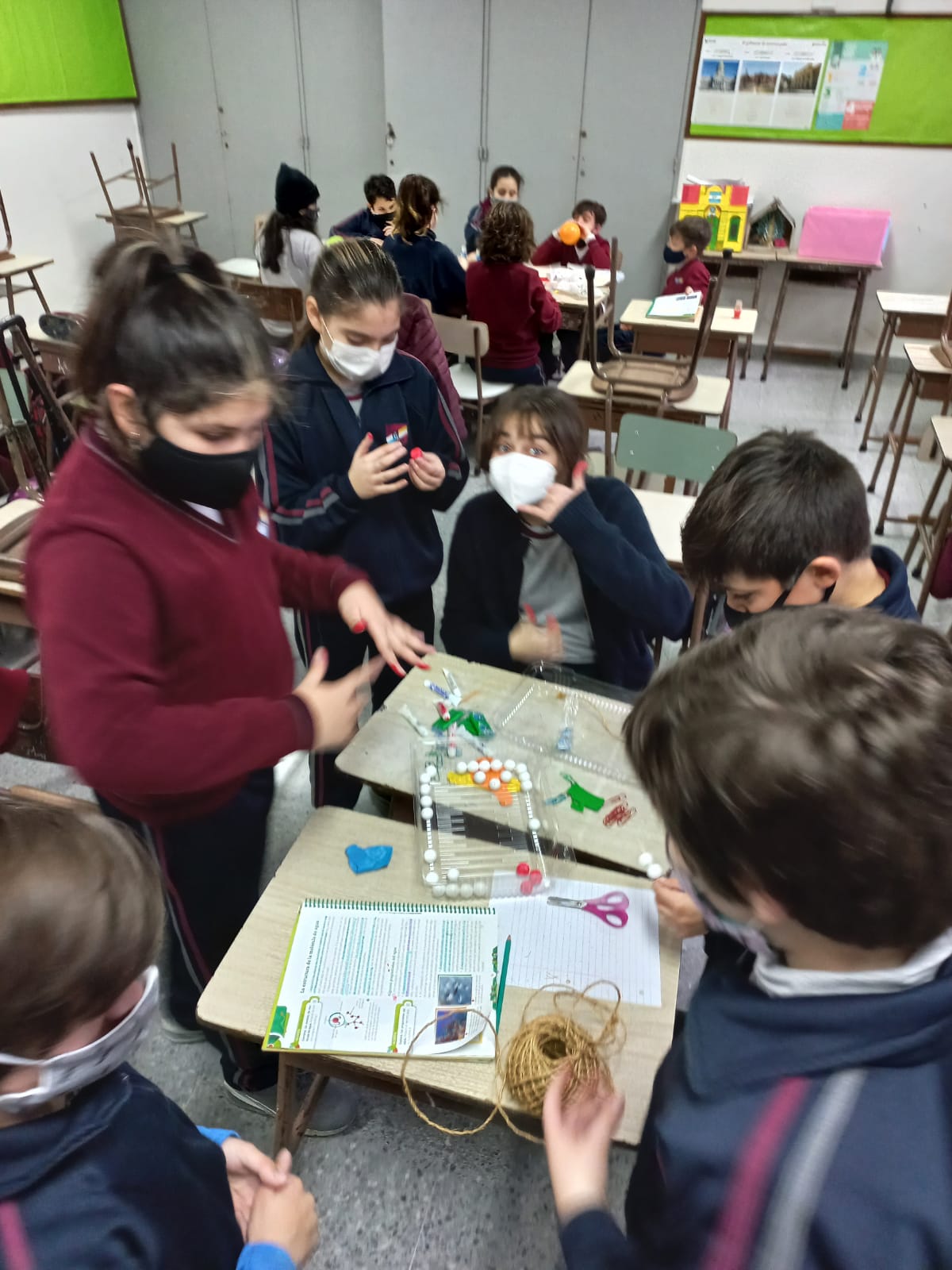 Los chicos y chicas de sexto grado realizando una maqueta sobre "Molecula de agua" (Cs. Naturales) con la seño Alejandra.