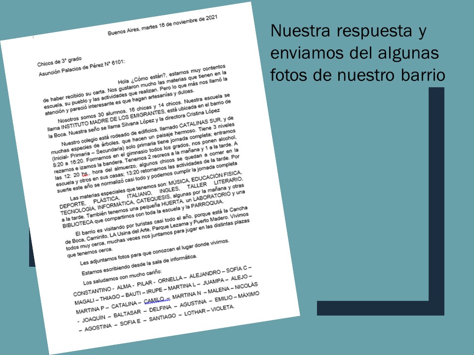 Respondimos la carta y les enviamos fotos de nuestro barrio … Una hermosa experiencia para todos!